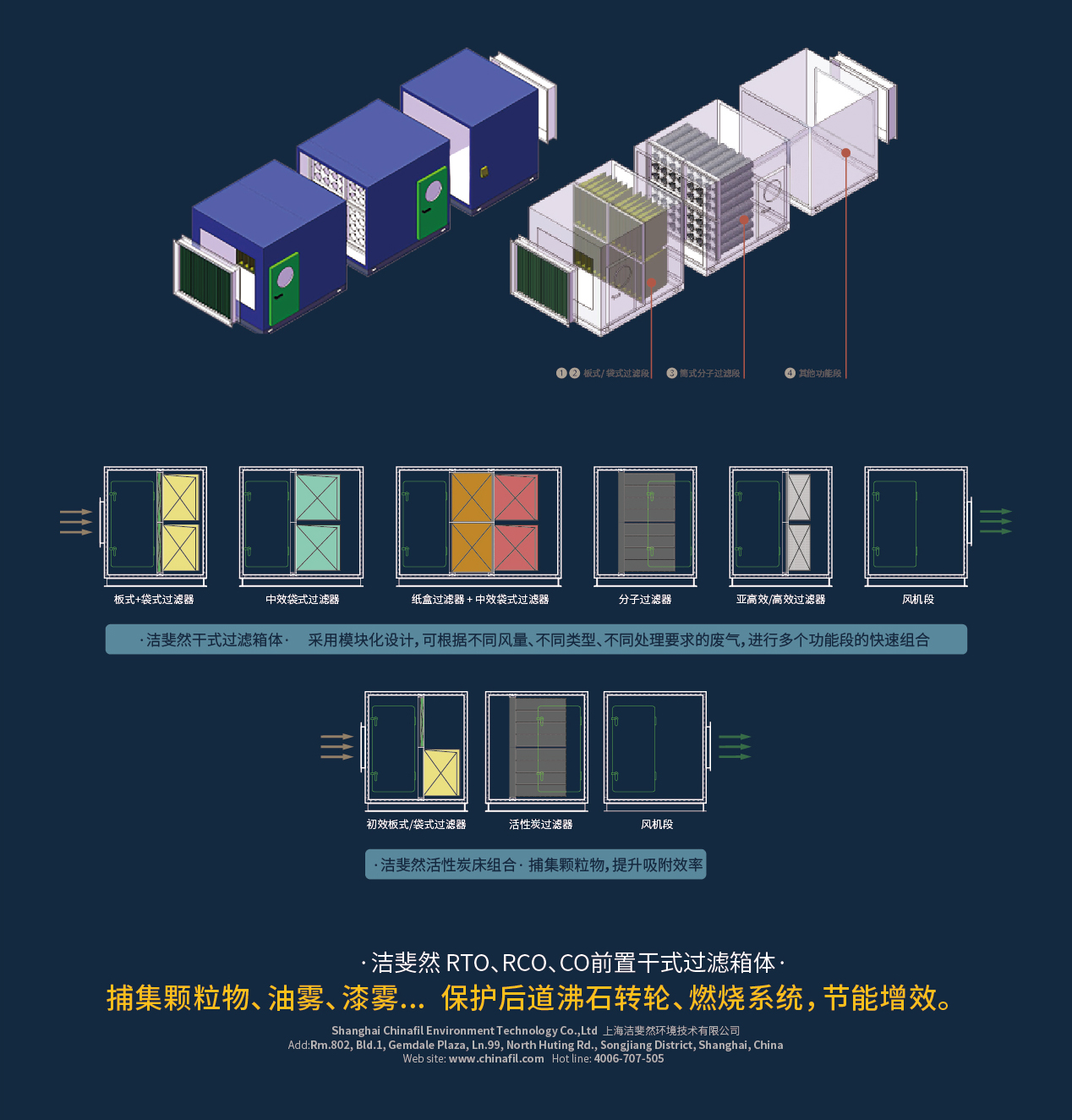乐鱼网干式过滤箱体适配一级或多级过滤器,对颗粒物、油雾、漆雾等物质进行拦截捕集,❶,提高废气处理效率,❷,为沸石转轮、燃烧系统提供保护,减少转轮、蓄热燃烧设备 堵塞、结垢的风险。小小的投入,一“箱”两悦,增效、节能、降本,延长RTO、RCO、CO设备使用寿命。