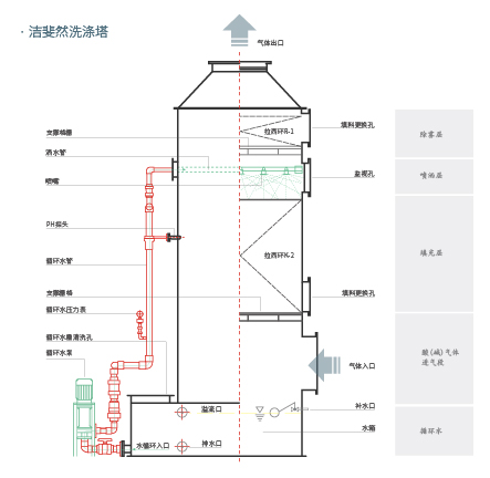 洗涤塔设备由塔体、筛板、喷淋管路、除雾层、循环水泵、循环水池、加药系统等单元组成,广泛应用于工业废气除尘净化,效果良好。